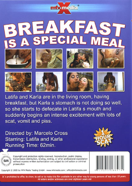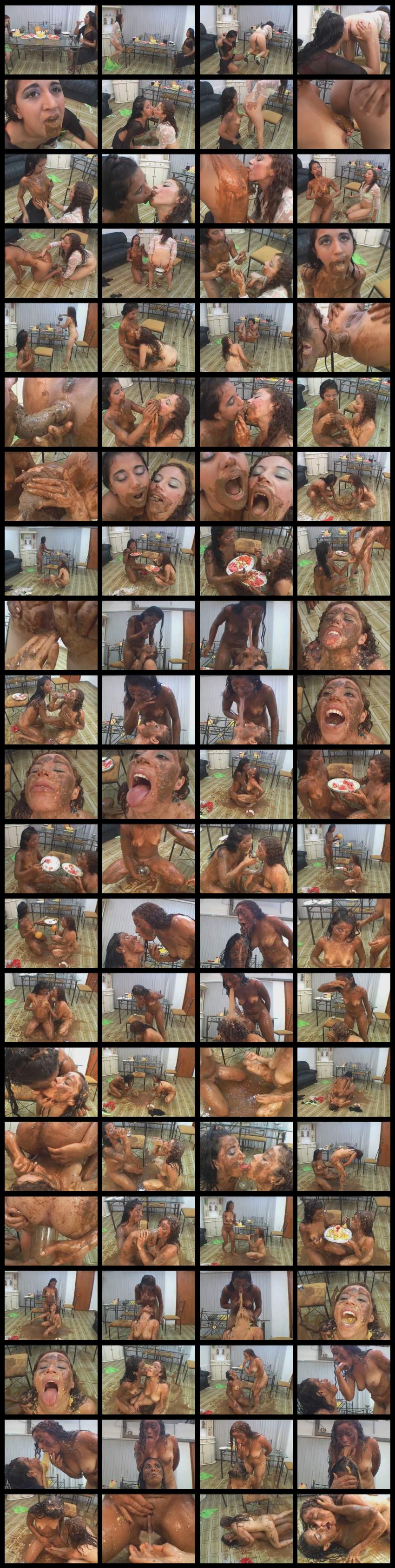 Свежий понос хлынул фонтаном, наполняя рот девушки до отказа и заливая тело. Благодаря такому форс-мажору, в меню завтрака был включен новый ингредиент. Девушки стали намазывать испражнения на хлеб и жадно поедать бутерброды с говном. Тут уже и Латифе захотелось посрать. Она выдавила из себя колбаску Карле в ротик и процесс дегустации дерьма продолжился. Сверху всё это они затоптали фруктовым салатом и запили соком. Но видать нельзя смешивать разные продукты – девушек стало тошнить. Однако не бывает худа без добра – девушки решили попробовать блевотину на вкус и опустошили свои желудки, обильно обрыгав друг-друга. Приятного аппетита!